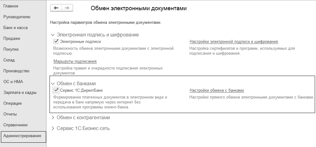 Рис. 8.7.1. Подключение "1С:ДиректБанк"
