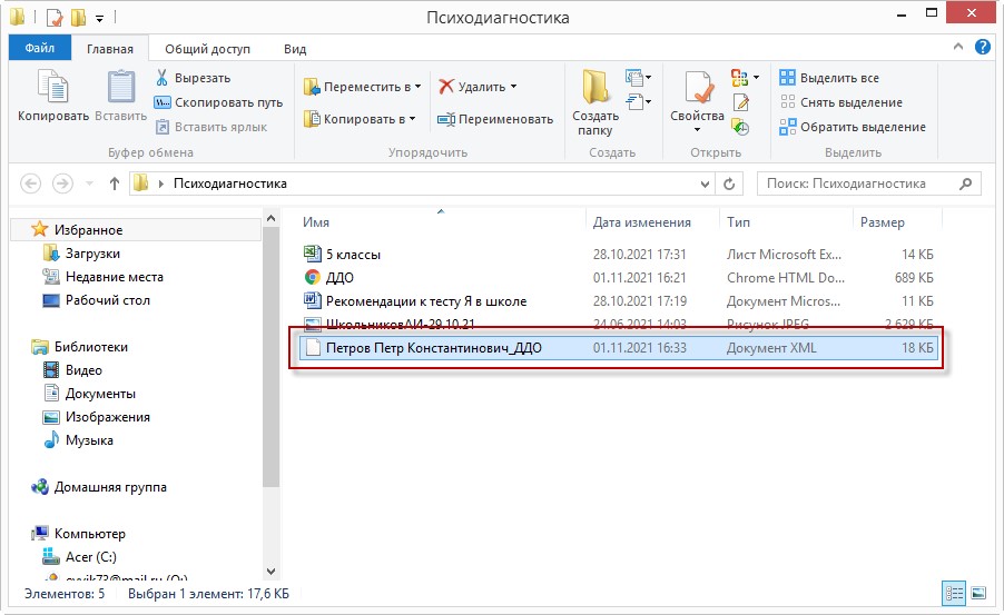 После того как все дети будут протестированы, а результаты диагностики сохранены в виде электронных бланков в формате *xml, необходимо эти бланки скопировать на флешку или другой носитель информации и перенести на компьютер, где установлена программа линейки «1С:Психодиагностика».