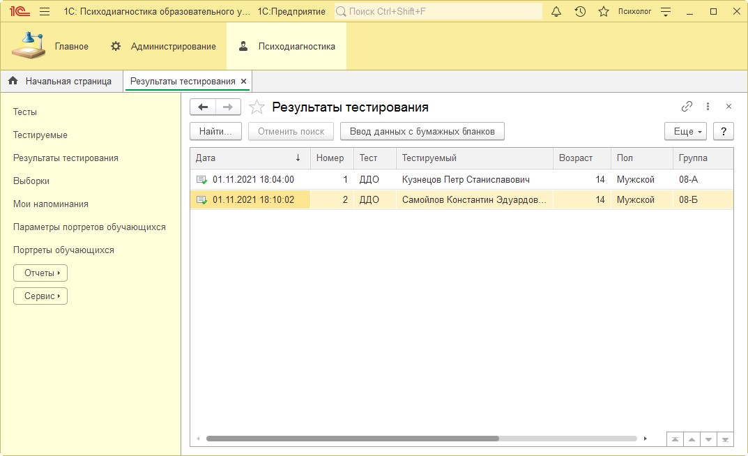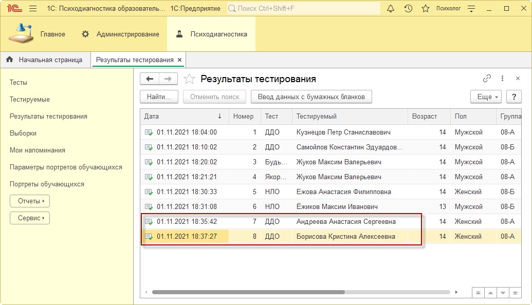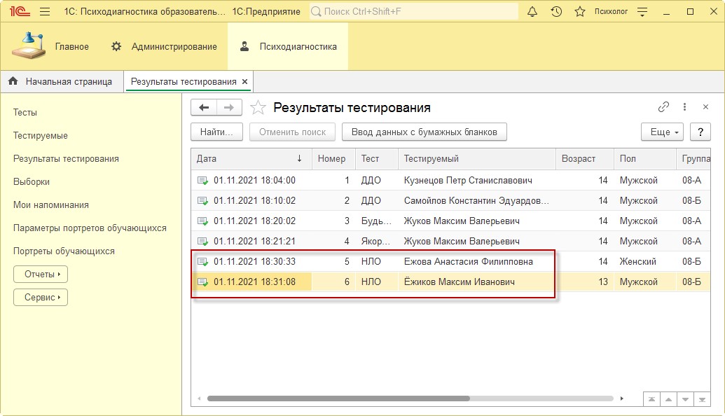 - Подготовьте бумажные бланки для тестирования по методике НЛО учащихся 8Б класса Ежовой Анастасии и Ёжикова Максима. Внесите результаты тестирования с бумажных бланков в программу.