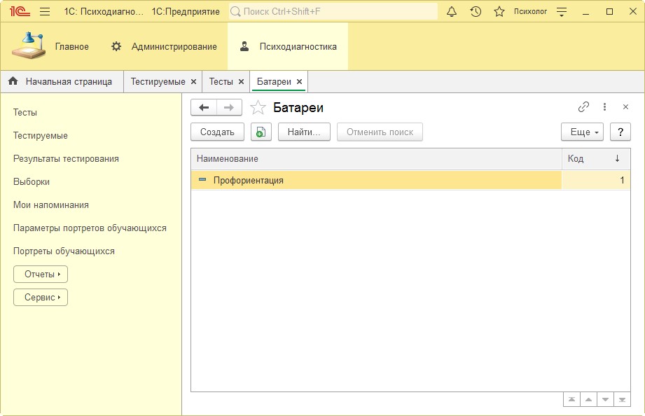 - Создайте батарею тестов «Профориентация»: