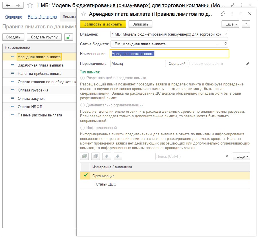 Лимиты расходования денежных средств создаются по статьям бюджетов для конкретной модели бюджетирования. При установке лимитов можно использовать аналитику статей бюджетов. Лимиты могут быть созданы с разной детализацией и периодичностью.