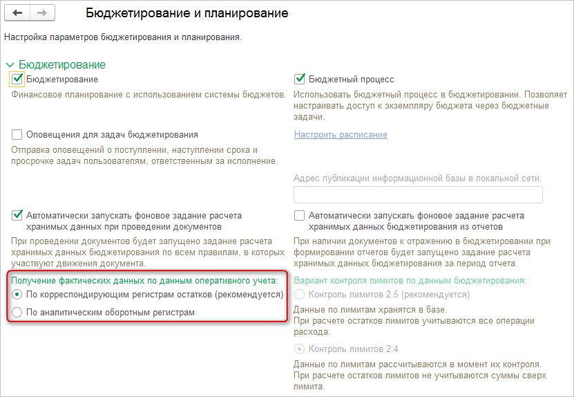 Начиная с подредакции 2.5.16 источником для получения фактических данных могут быть аналитические оборотные регистры или балансовые/корреспондирующие регистры. Источник для получения фактических данных регулируется набором функциональных опций "Получение фактических данных по данным оперативного учета". Если установлена опция "По аналитическим оборотным регистрам", то фактические данные будут формироваться так как они формировались до подредакции 2.5.16. При установке опции "По корреспондирующим регистрам остатков" фактические данные будут формироваться по балансовым или корреспондирующим регистрам. Начиная с подредакции 2.5.16 приоритетным является вариант получения фактических данных по балансовым/корреспондирующим регистрам остатков. Новый вариант позволяет увеличить количество используемых в бюджетировании хозяйственных операций.