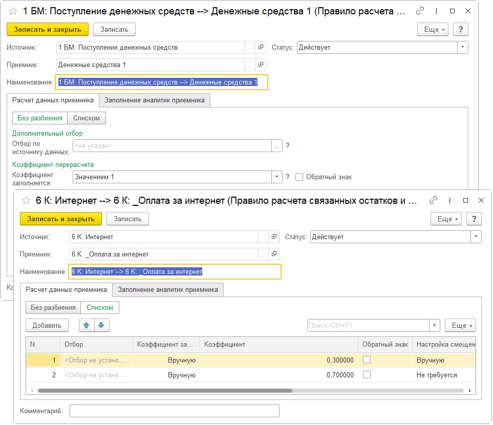 Начиная с подредакции прикладного решения 2.5.25 связи между показателями бюджетов и статьями бюджетов настраивается в справочнике "Правила расчетов связанных остатков и оборотов бюджетов". При помощи данного справочника настраиваются влияние статей бюджетов на связанные показатели бюджетов и на другие статью бюджетов. Например, при помощи данного справочника можно настроить влияние статьи бюджетов "Поступление денежных средств" на показатель бюджетов "Денежные средства" или влияние статьи бюджетов "Расходы за интернет" на другую статью бюджетов "Оплата расходов за интернет" или "НДС входящий". При настройке правила могут быть указаны отборы для данных источника, коэффициенты пересчета данных источника в данные приемника и алгоритмы заполнения аналитика для приемника. В качестве коэффициентов пересчета могут быть указаны коэффициенты, задаваемые вручную или при помощи нефинансовых показателей (о нефинансовых показателях см. ниже в этом разделе).