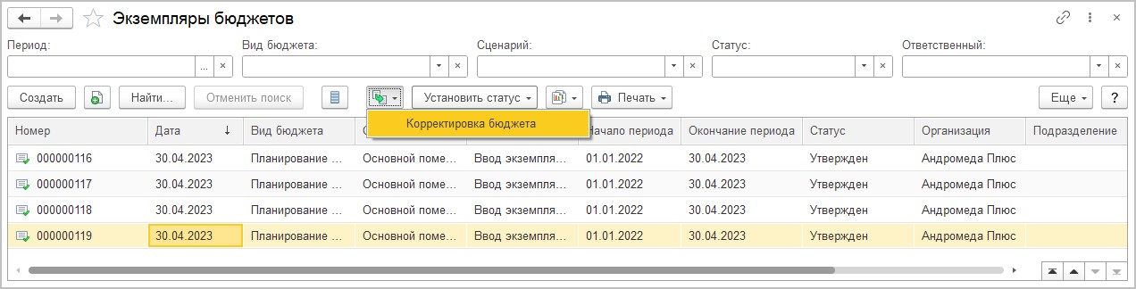 При установке в модели бюджетирования параметра "Утверждать бюджеты" в информационной базе становится доступно управление жизненным циклом экземпляра бюджета при помощи статусов.