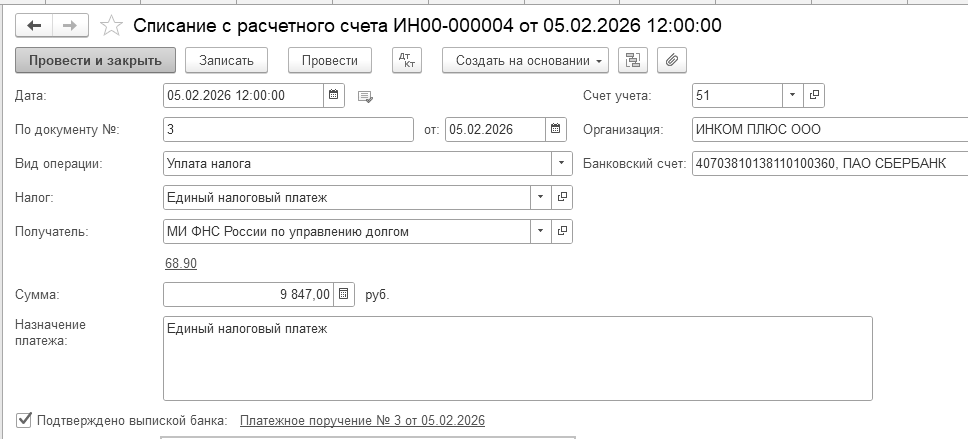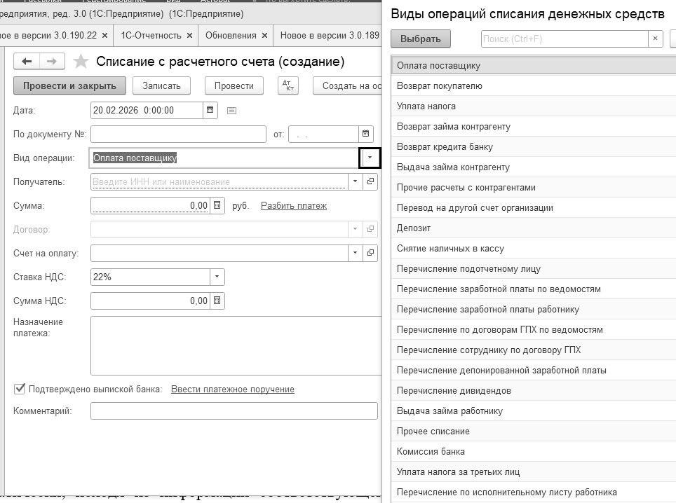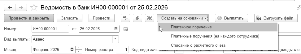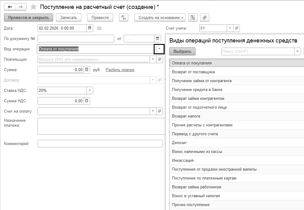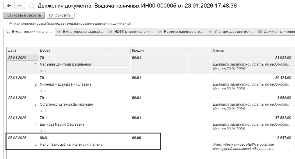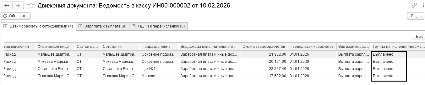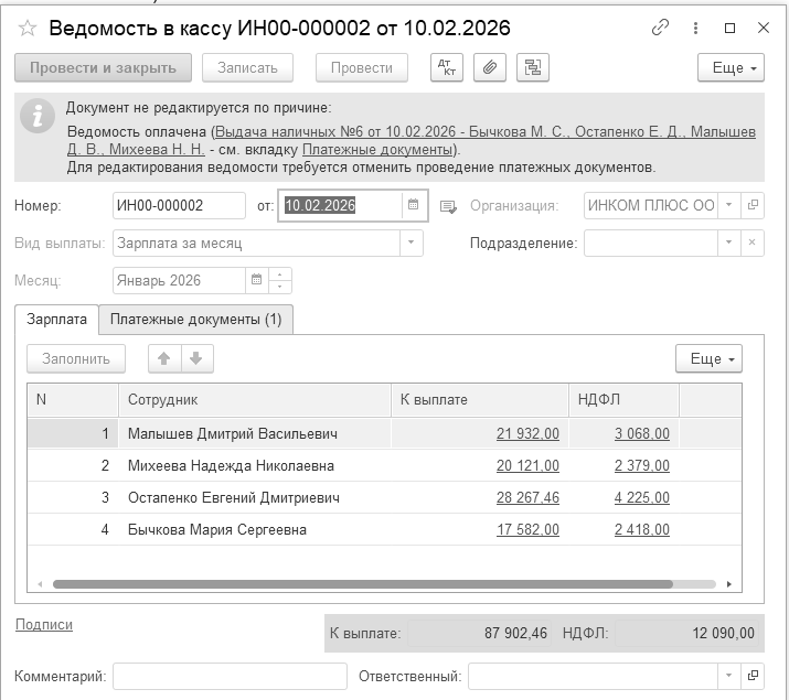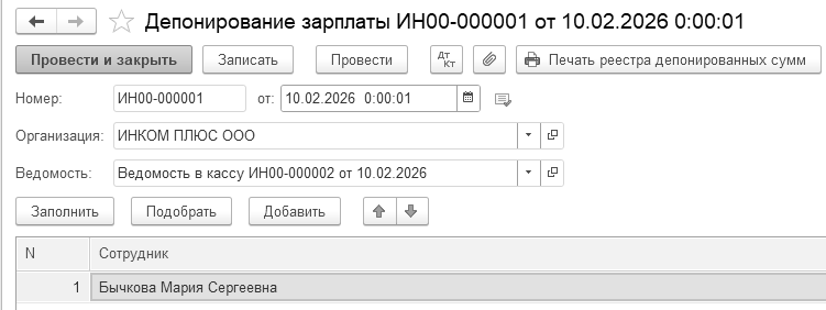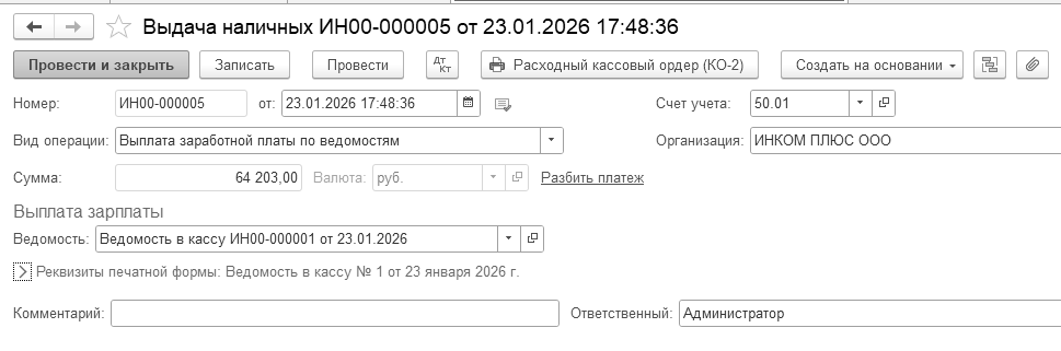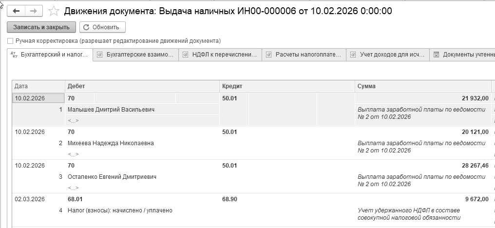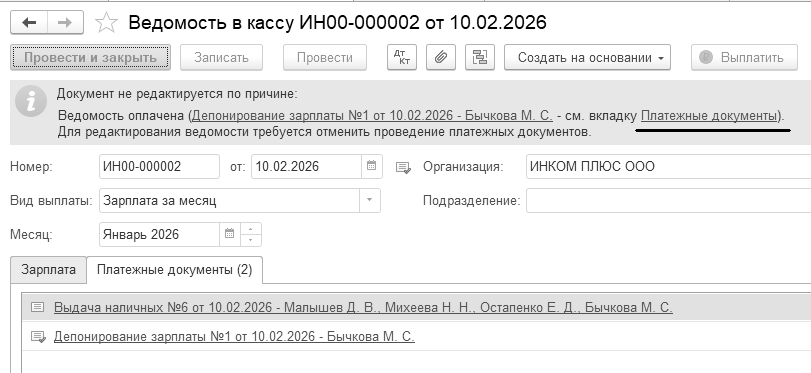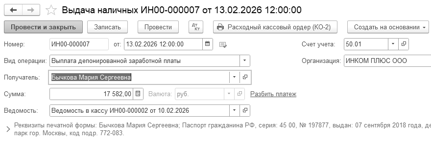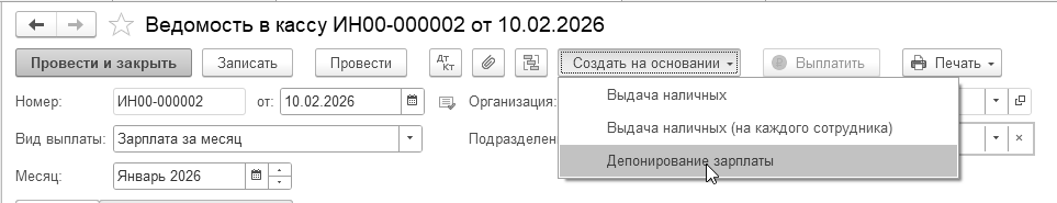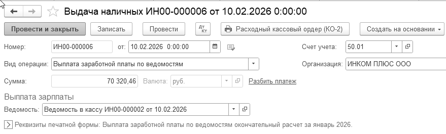 10.02.2026 года из банка в кассу поступили денежные средства в сумме 184 000 рублей для выплаты заработной платы за январь 2026 года, на представительские расходы. Вид операции – получение наличных в банке.