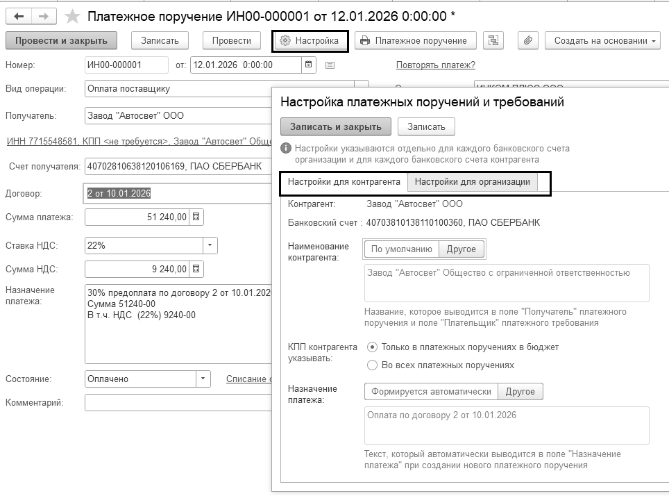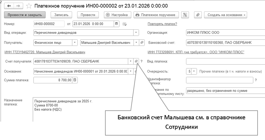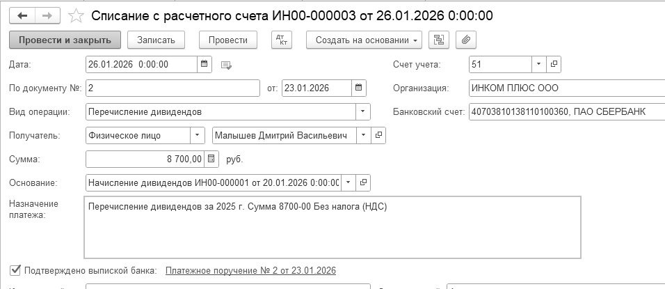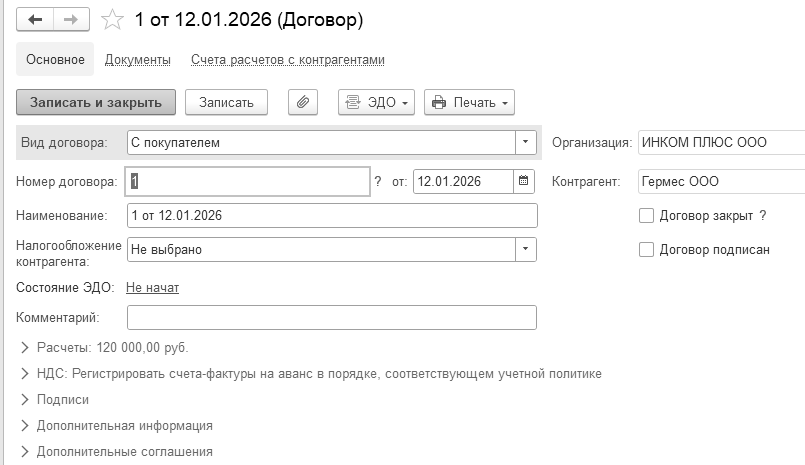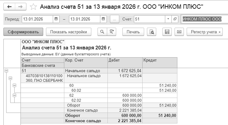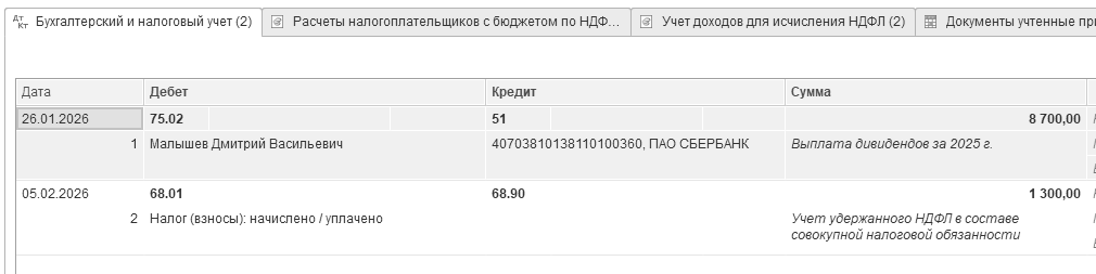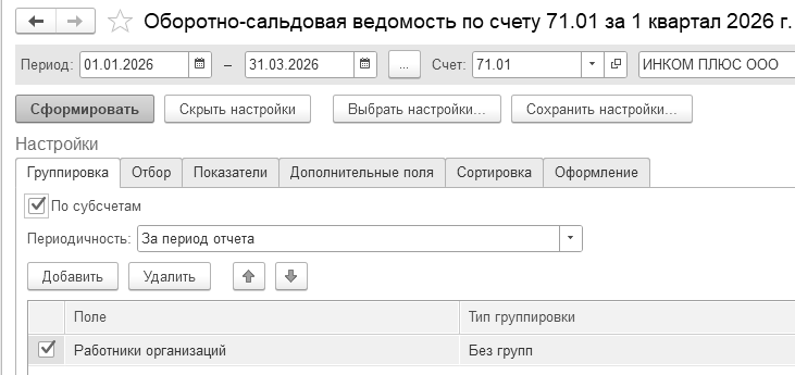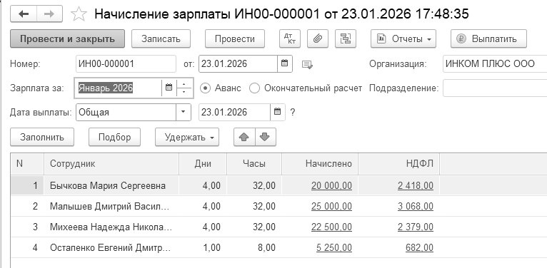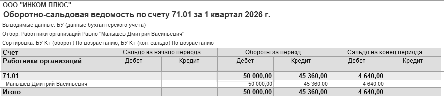 26.01.2026 года работник Малышев Д.В. командирован в Астрахань для согласования графика поставки товаров сроком на 5 рабочих дней. Перед командировкой Малышеву Д.В. 26.01.2026 года был выдан аванс в сумме 12 000 руб. (РКО в базу уже занесен). Учетной политикой установлен размер суточных 100 рублей.