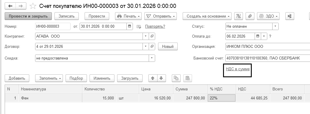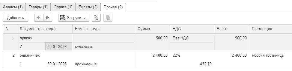 гостиница – 2 400 руб. В онлайн-чеке №1 и счете-фактуре № 1 от 30.01.2026 года гостиницы "Россия" выделен НДС 22% (432,79 руб.);