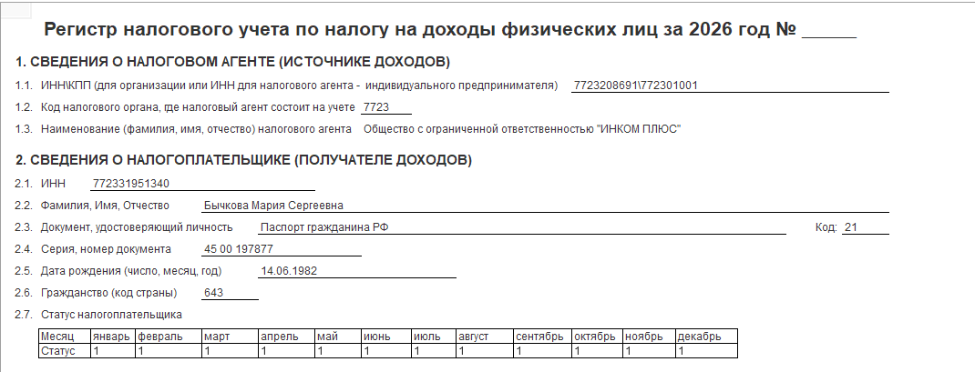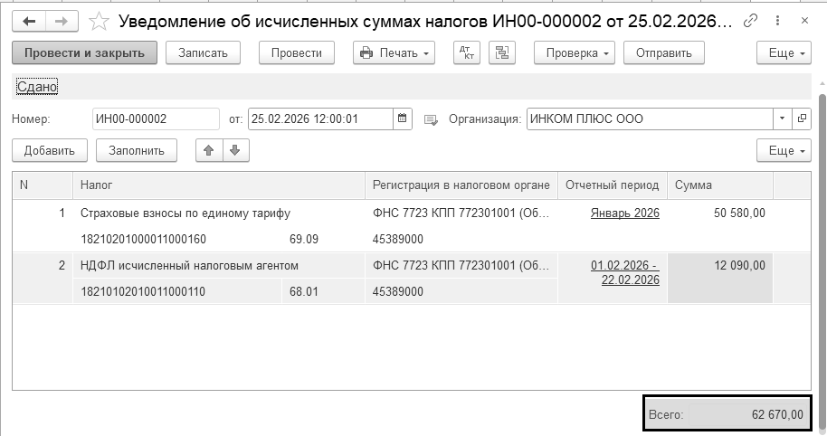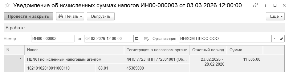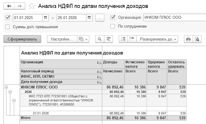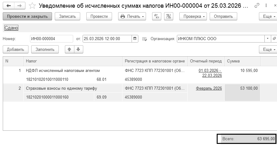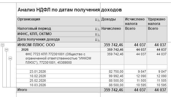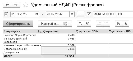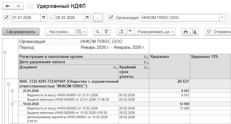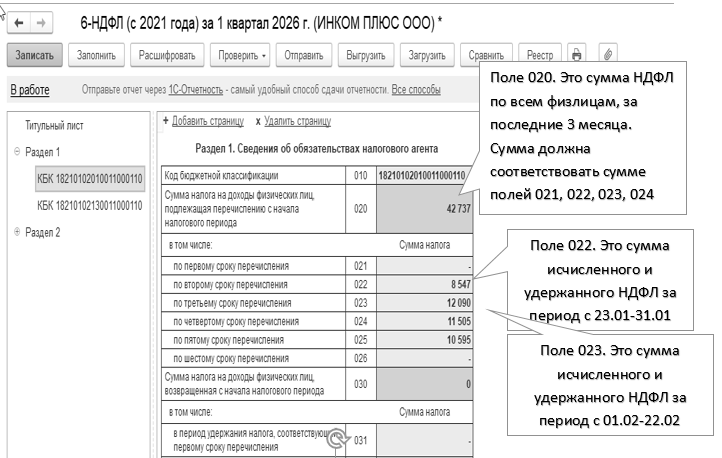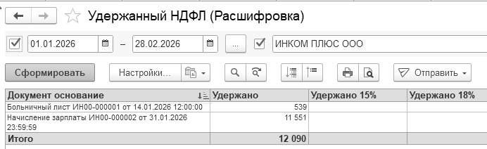 Создайте отчет "6-НДФЛ" за I квартал 2026 года по организации "ИНКОМ ПЛЮС".