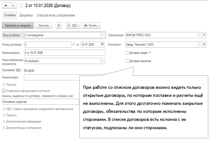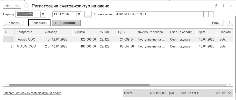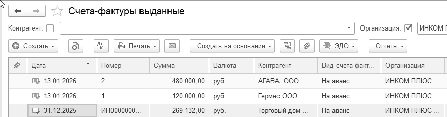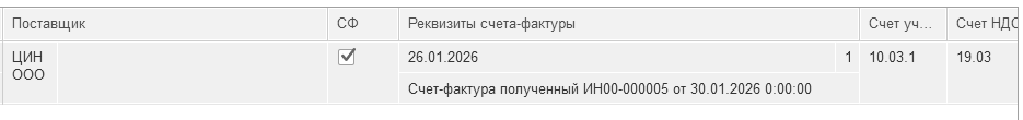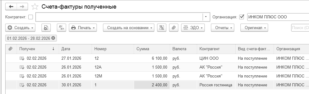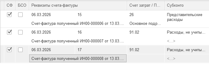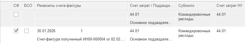 Если аналитика по счету 44.01 в конце строки закладки "Прочее" заполнена не будет (субконто 1 – "Командировочные расходы"), то помощник "Закрытие месяца" счет 44.01 не закроет, и останется остаток на 28.02.2026 года. После проведения авансового отчета в базе зарегистрируются четыре счета-фактуры, которые сделают проводки по принятию НДС к вычету (рис. 6.1.9):