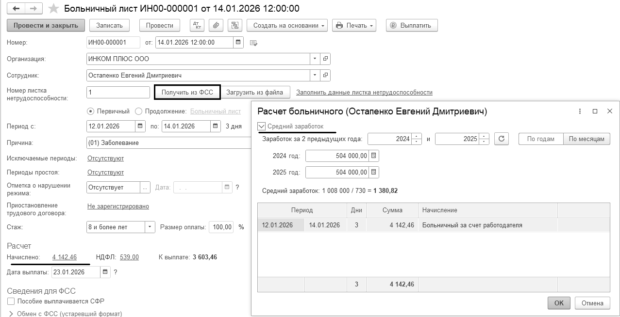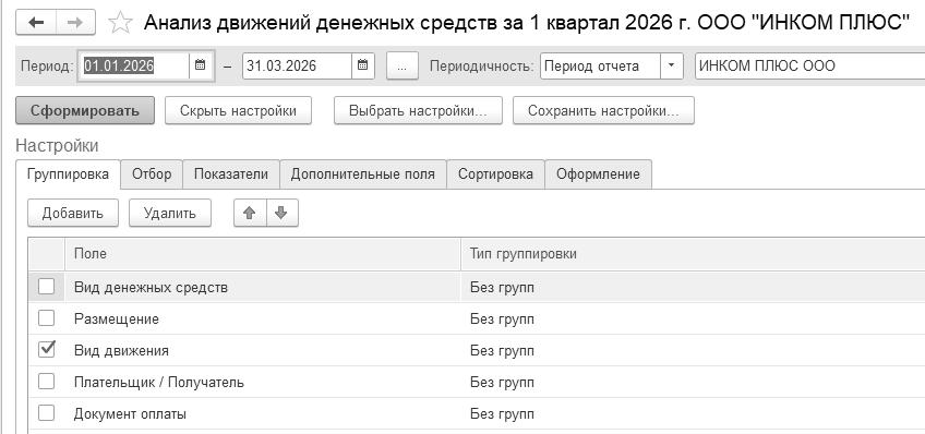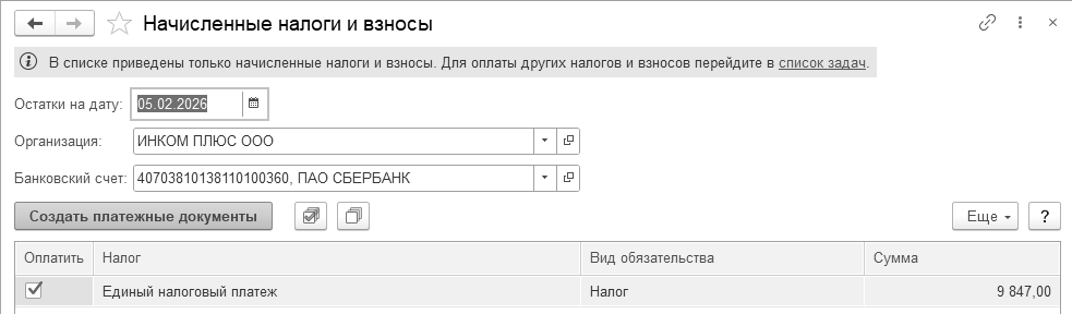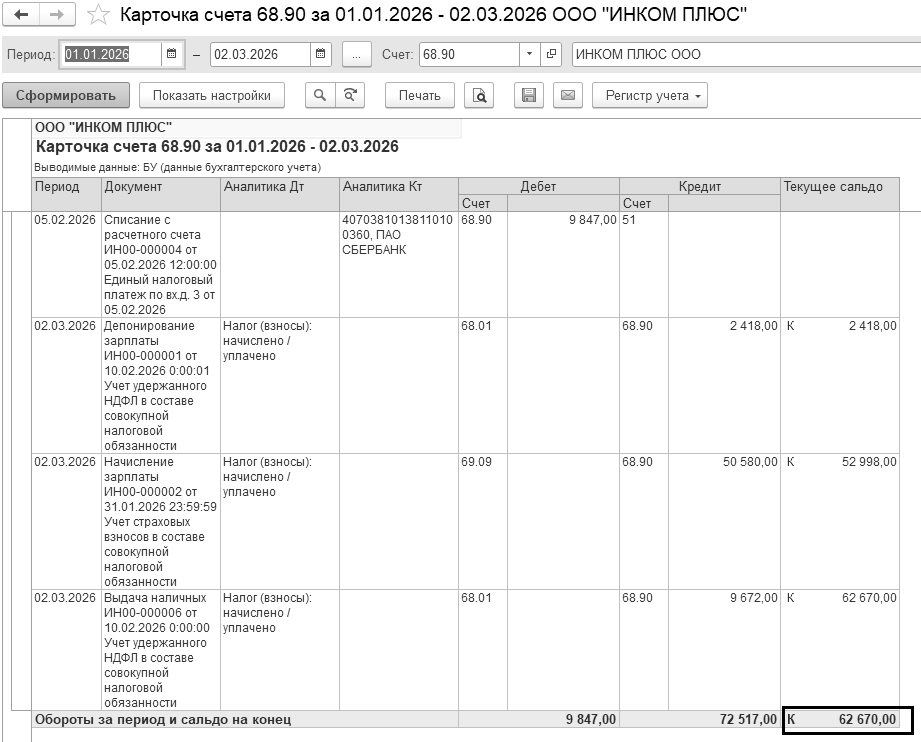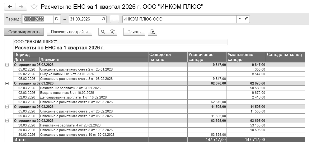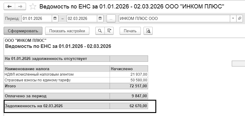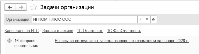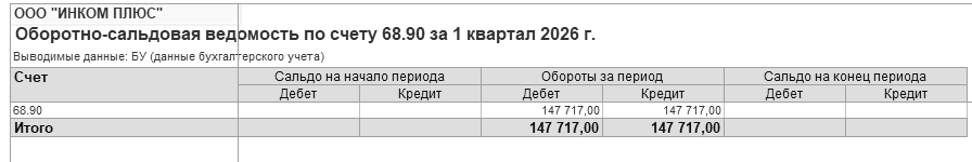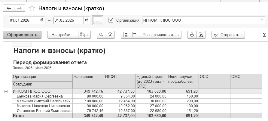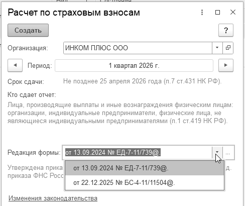 Создайте отчет "Расчет по страховым взносам" за I квартал 2026 года по организации "ИНКОМ ПЛЮС".