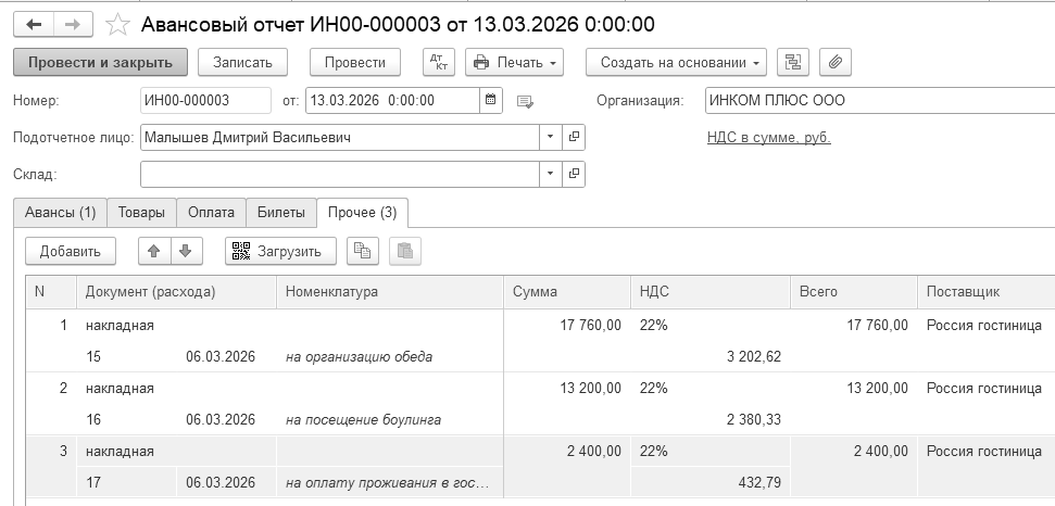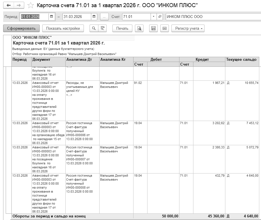 В момент проведения авансового отчета в базе зарегистрировался документ "Счет-фактура полученный" от поставщика ООО "ЦИН". Данный документ оформил проводку по принятию НДС к вычету в сумме 360,66 руб. и регистр накопления "НДС предъявленный" с видом движения "– Расход".