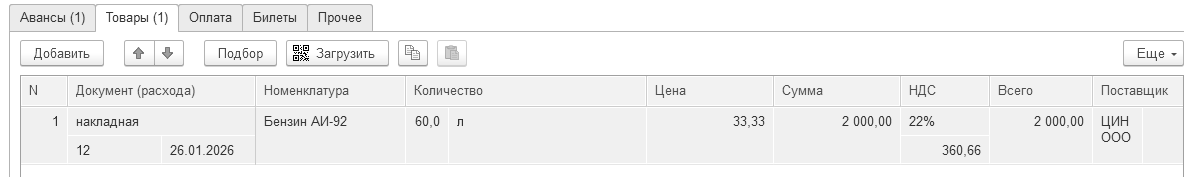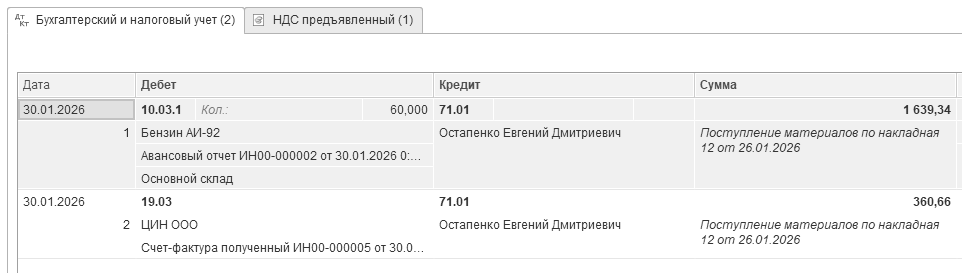 30.01.2026 года принят авансовый отчет от Остапенко Е.Д. о покупке 60 литров бензина АИ-92 на сумму 2 000 руб., НДС 22% в том числе (корр. счет 10.03.1). ООО "ЦИН" представил накладную № 12 и счет-фактуру № 12 от 26.01.2026 года. Бензин оприходован на основной склад.