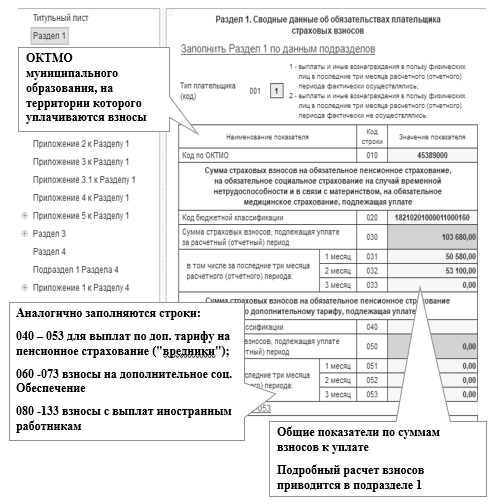 Рис. 8.6.10. Фрагмент формы отчета "Расчет страховых взносов", титульный лист и раздел 1, подраздел 1
