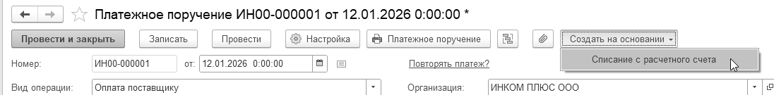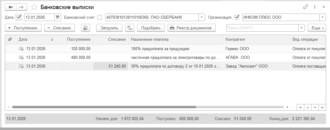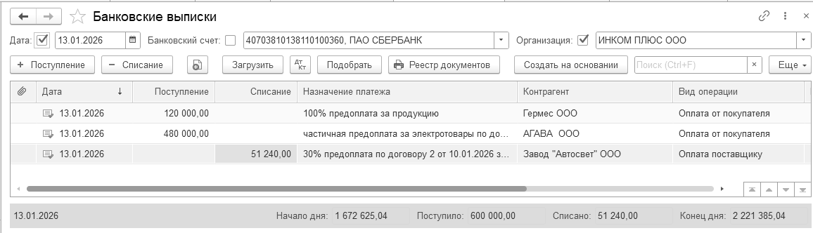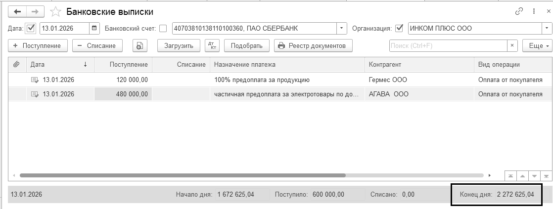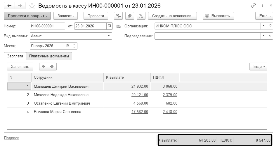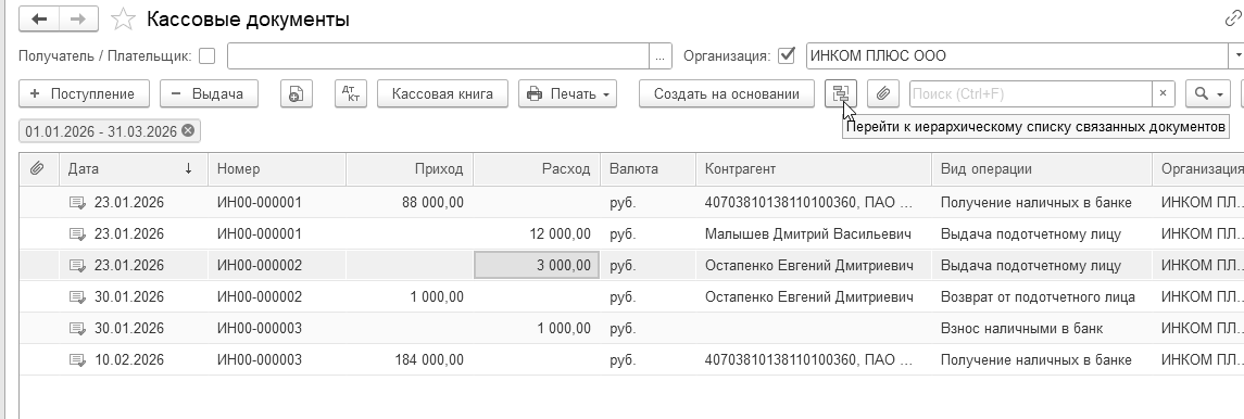 30.01.2026 года сотрудник Остапенко Е. Д. возвратил в кассу "ИНКОМ ПЛЮС" неиспользованную сумму 1 000 руб. Создайте документ "Поступление наличных".
