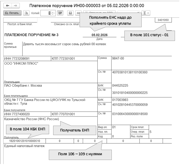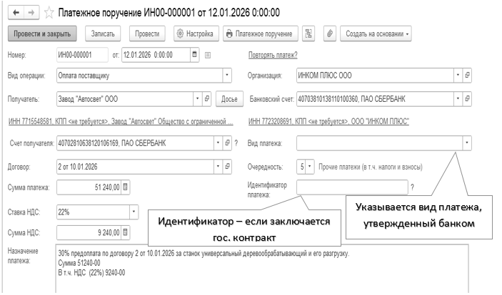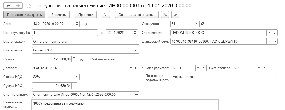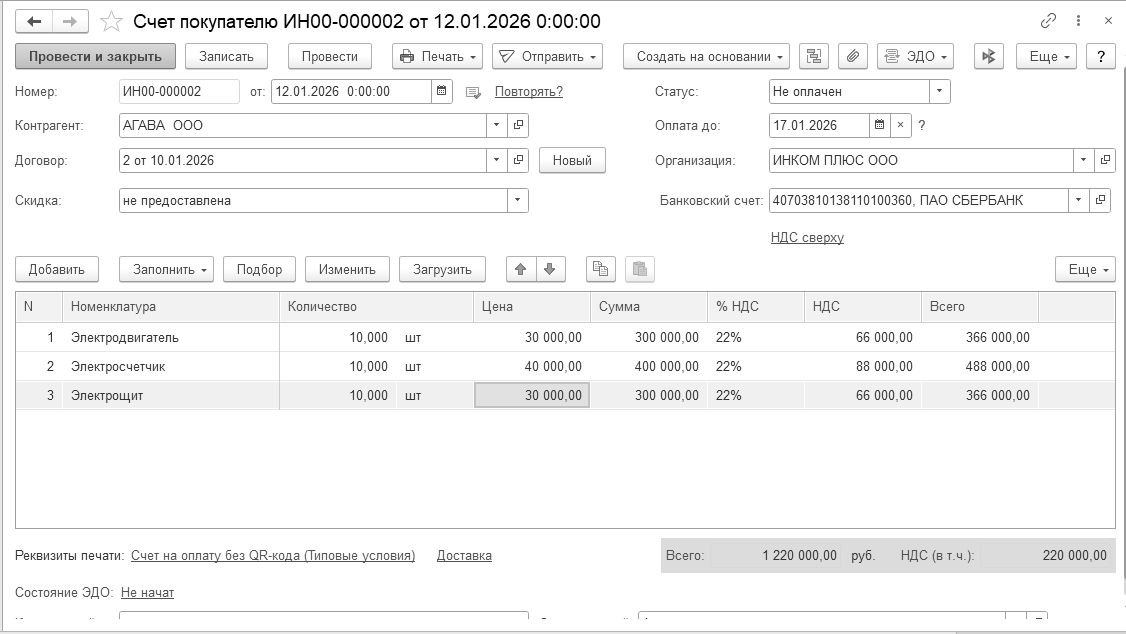 упаковочный материал, который в дальнейшем будет использован для выпуска продукции (100 шт.) – 6 100 руб., НДС 22% в том числе. Накладная № 12 и счет-фактура № 12 от 27.01.2026 года ООО "ЦИН" предъявлены в бухгалтерию "ИНКОМ ПЛЮС". Материал должен быть оприходован на счет 10.01.