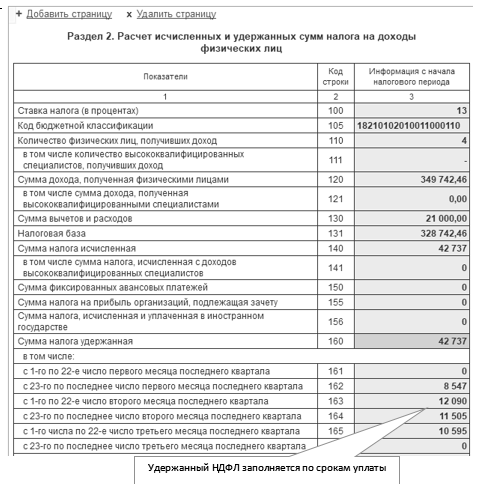 Раздела 2 "Расчет исчисленных, удержанных и перечисленных сумм налога на доходы физических лиц";