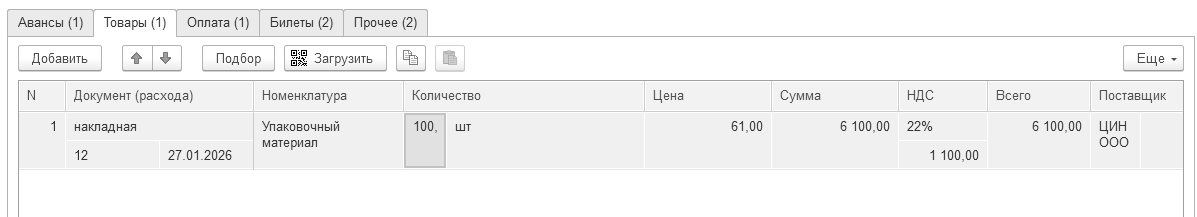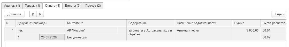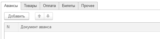Заполните закладки "Авансы", "Товары", "Оплата", "Билеты" и "Прочее".