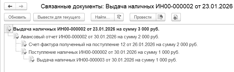 Для окончательного расчета с подотчетным лицом на основании документа "Авансовый отчет" в программе можно создать такие документы, как: