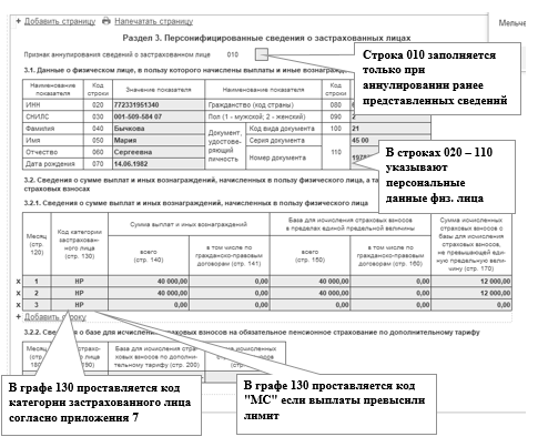 Изменение кодов застрахованного лица (указывают в зависимости от своего тарифа по графе 130 подраздела 3.2.1 из раздела 3 расчета). У МСП появились три кода со следующей расшифровкой: