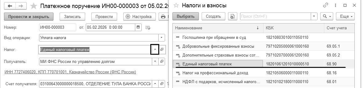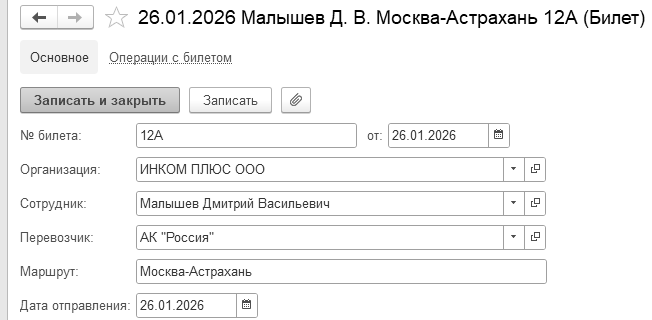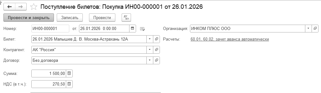 Создать два документа "Поступление билетов" от 26.01.2026 на даты вылета 26.01.2026 и 30.01.2026 года, ориентируясь на рисунок 6.1.4.