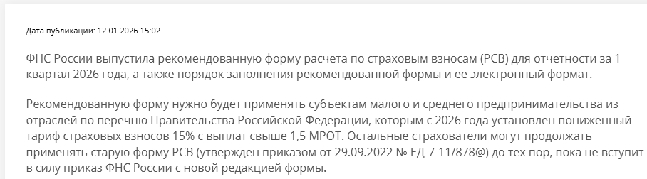 ФНС опубликовала рекомендуемую форму расчета по страховым взносам (РСВ), предназначенную для использования субъектами малого и среднего бизнеса при подготовке отчетности за I квартал 2026 года. Это связано с тем, что действующая форма РСВ, утвержденная приказом от 29.09.22 № ЕД-7-11/878@, не учитывает последние изменения в Налоговый кодекс, в частности, отмену ряда льгот по взносам. Использовать нужно формы, которые ФНС предложила в письме от 22.12.2025 № БС-4-11/11504@ (рис. 8.6.8).
