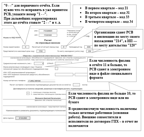 РСВ сдают каждый квартал не позднее 25-го числа месяца, следующего после отчётного периода. За 2026 год по новой форме: