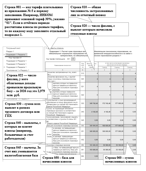 Субъекты МСП, которые применяют сниженный тариф в 2026 году, заполняют два подраздела 1 из раздела 1 с кодами "01" и "32". Остальные (без права на сниженный тариф) — только один подраздел 1 из раздела 1 (по коду "01"