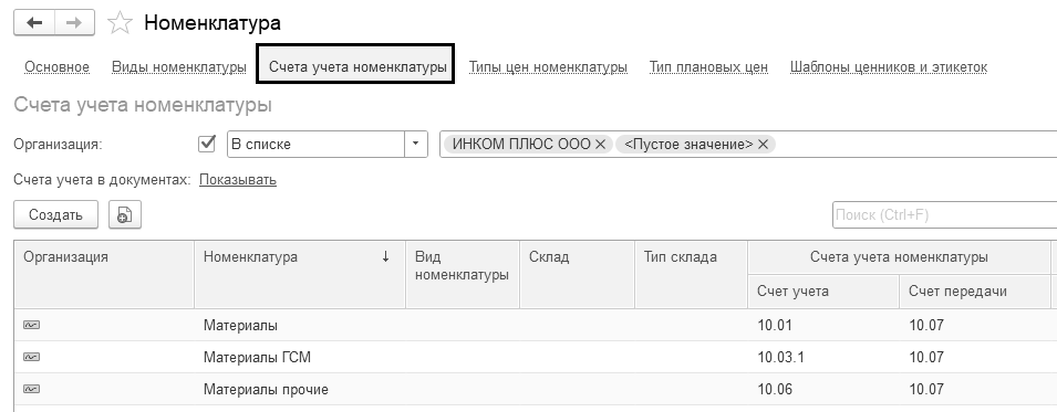 В корне справочника "Номенклатура" создайте папку "Материалы ГСМ". Для данной папки следует скопировать все те счета, которые назначены папке "Материалы". Для этого откройте справочник "Счета учета номенклатуры", скопируйте папку "Материалы" (F9), выберите вместо нее папку "Материалы ГСМ", и замените счет 10.01 на счет 10.03.1. Сравните выполнение задания с рисунком 6.1.10.