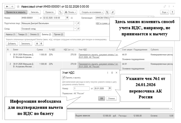 Авиабилет №12М Астрахань - Москва – 1500 руб., в т. ч. НДС 22% (270,50 руб.), приобретен у перевозчика АК "Россия" 26.01.2026 на дату отправления 30.01.2026 года;