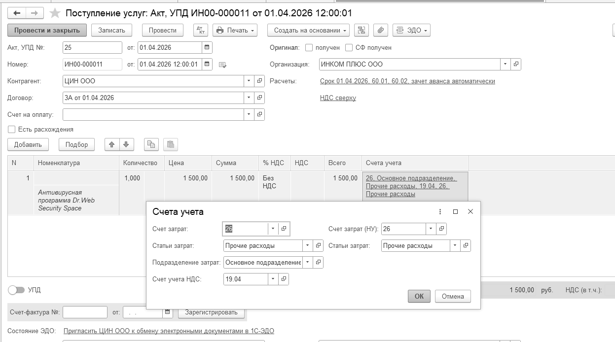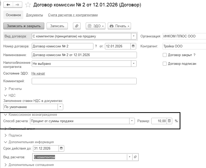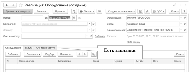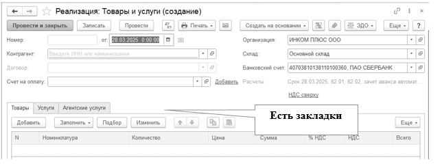 Если бы организация ООО "ИНКОМ ПЛЮС" оказывала агентские услуги, то на закладке "Агентские услуги" следовало бы указать контрагента (принципала), услуги которого наша организация оказывает.