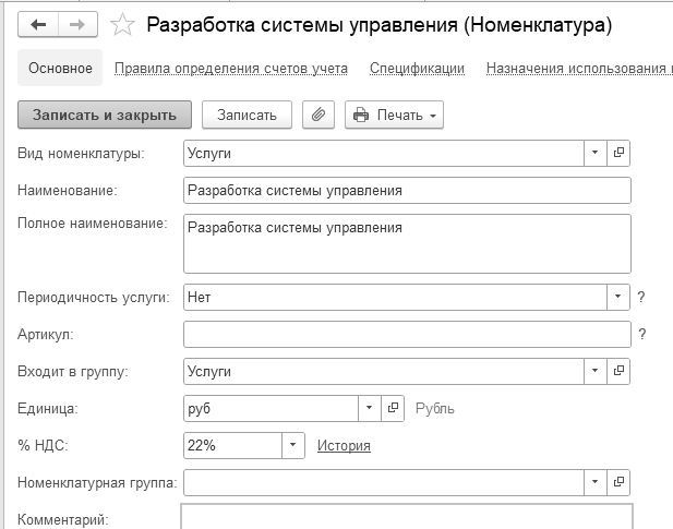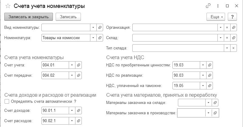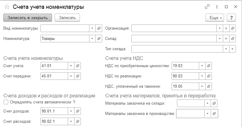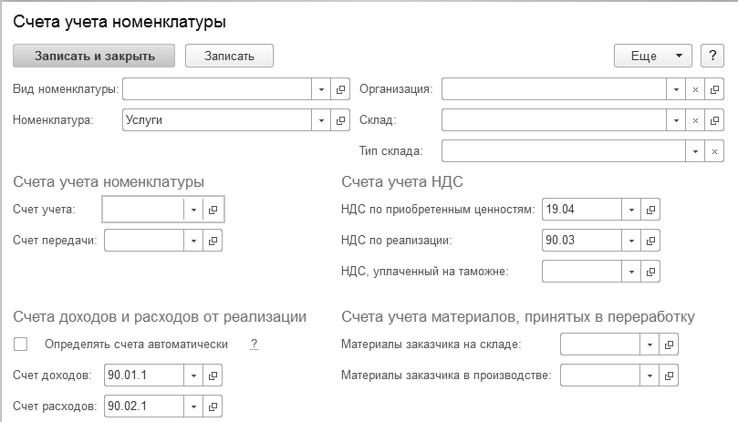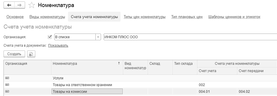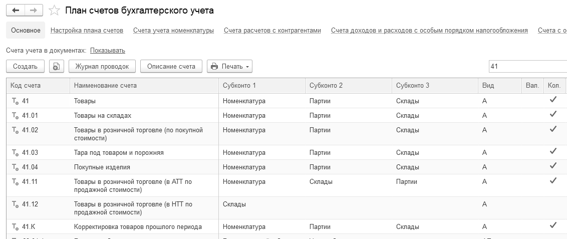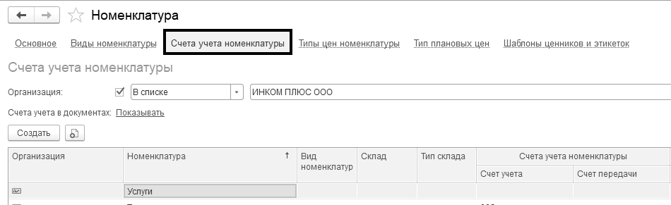 (меню "Панель разделов/Справочники/Панель навигации/Товары и услуги/Номенклатура/Счета учета номенклатуры")