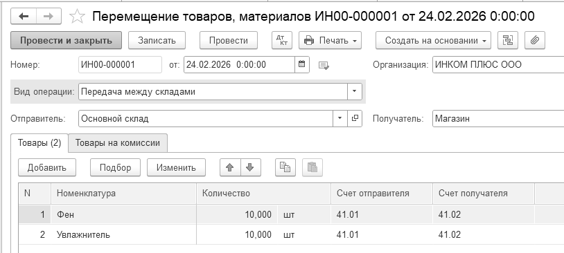24.02.2026 года создайте документ "Перемещение товаров, материалов" и переместите в магазин 10 шт. фенов и 10 шт. увлажнителей.