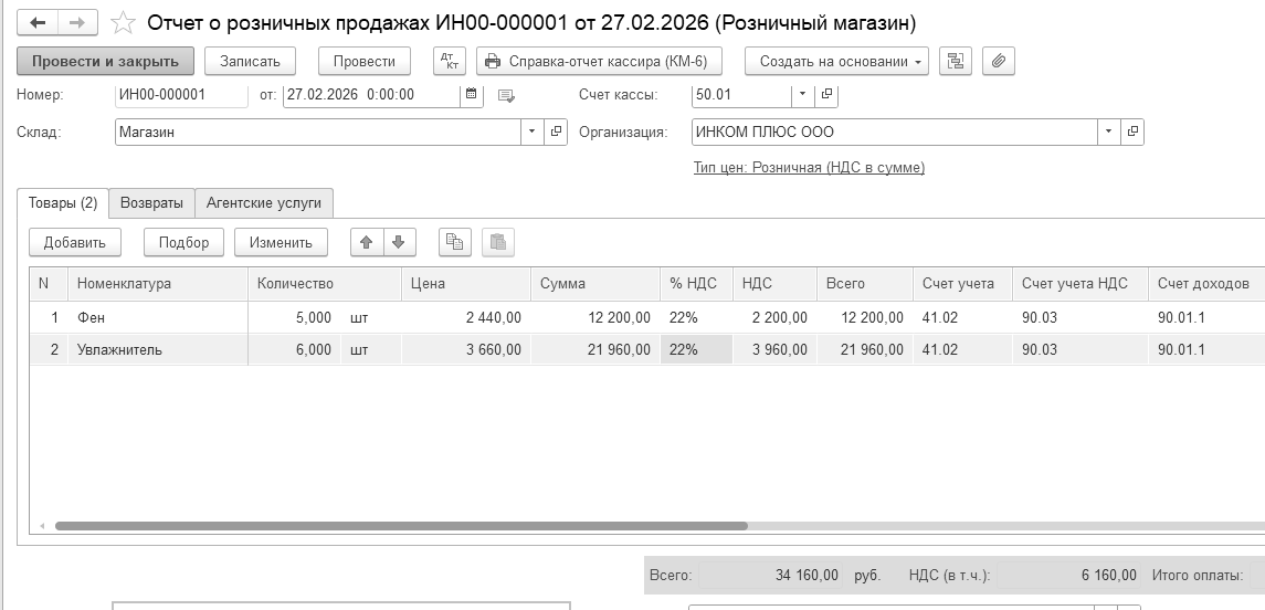 Как видно на рисунке 12.8.5 документ "Отчет о розничных продажах" состоит из закладок: "Товары", "Агентские услуги". Если бы в параметрах учета было настроено использование платежных карт, то еще была бы видна и закладка "Безналичные оплаты". Проведите документ.