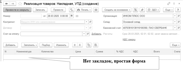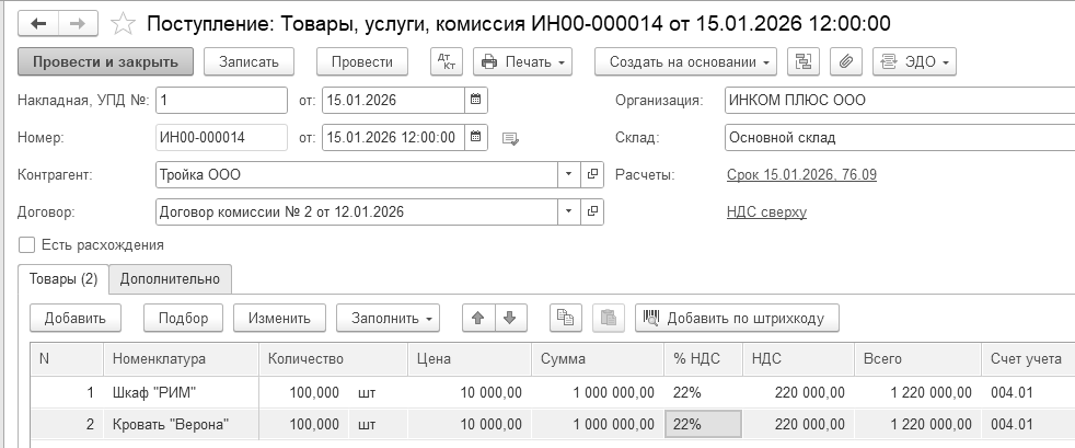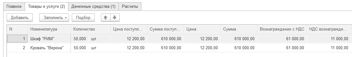 Обратите внимание, выбирая в табличную часть номенклатуру, счет учета устанавливается автоматически - 41.02. Заполнение документа представлено на рисунке 12.8.4.