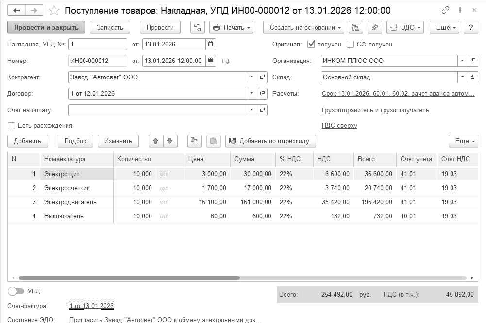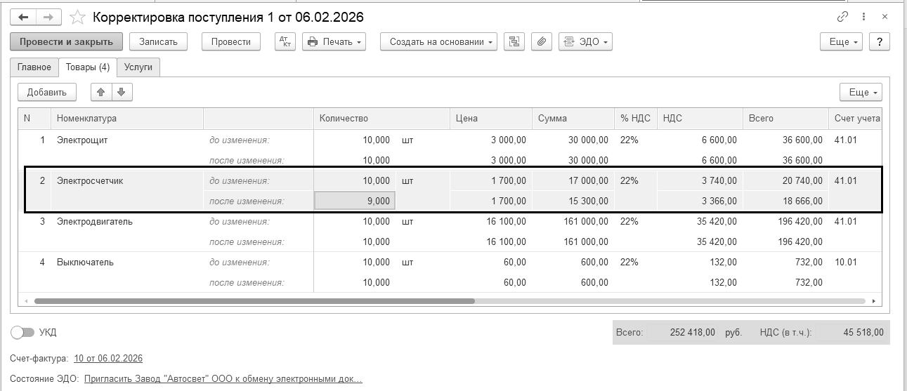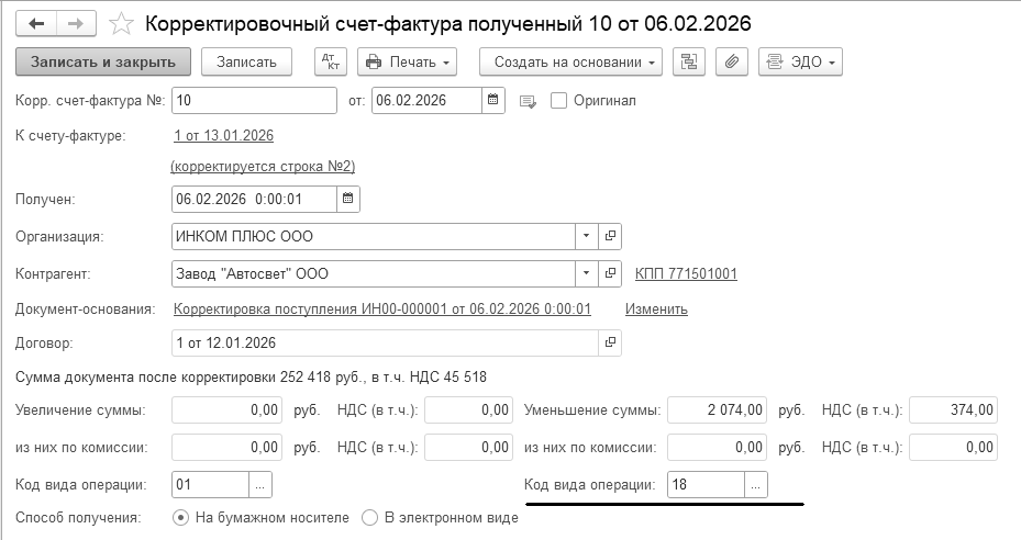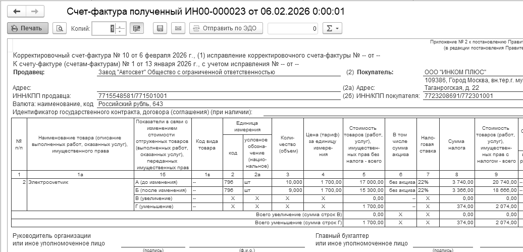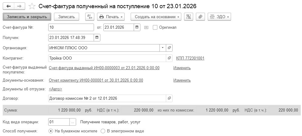 Одновременно, при нажатии кнопки "Отправить и получить" в форме "Текущие дела ЭДО" происходит получение электронных документов от поставщиков (входящие документы), мы их можем увидеть в разделе "Утвердить" формы. Одновременно на основании поступившего электронного документа создается новый документ учетной системы "Счет-фактура полученный". В новом документе "Счет-фактура полученный", сформированном на основании полученного электронного документа, будут автоматически заполнены сведения:
