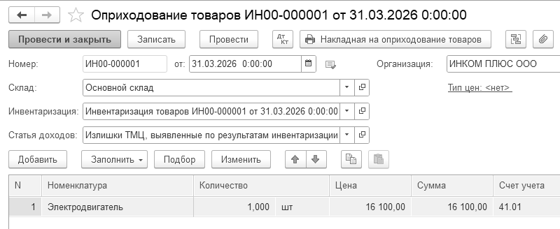 31.03.2026 года создайте документ "Оприходование товаров". В документ необходимо выбрать статью доходов "Излишки ТМЦ, выявленные по результатам инвентаризации" (данная статья есть в базе).
