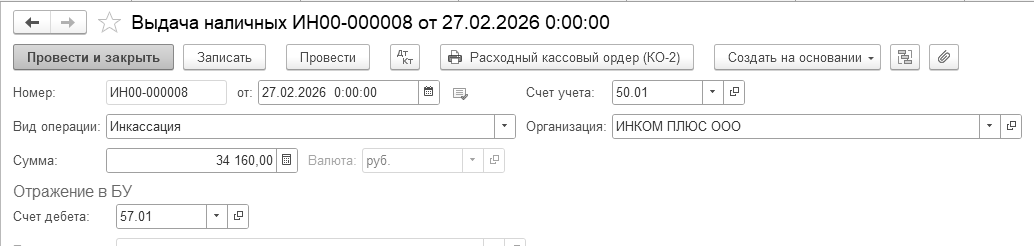 27.02.2026 года создайте документ "Выдача наличных" по виду операции "Инкассация". Сумма инкассации – 34 160 руб. (рис. 12.8.7).