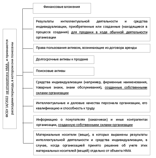 Стандарт не распространяется на средства индивидуализации, если они созданы силами компании. Нельзя относить к НМА активы, отраженные в схеме 10.2 (п. 8 ФСБУ 14/2022). Такие активы признаются расходами периода, в котором они понесены.