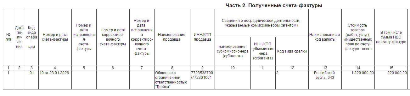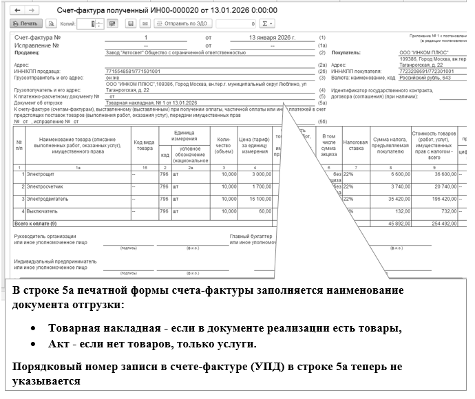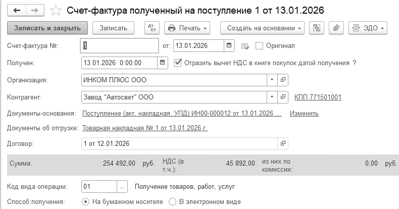 о номере и дате составления входящего счета-фактуры (поля "Счет-фактура №" и "от");