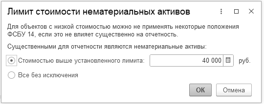 ФСБУ 14/2022, пункт 7 уточняет, что в отношении активов, имеющих стоимость за единицу ниже лимита, установленного организацией с учетом существенности информации о таких активах - затраты на приобретение, создание таких активов признаются расходами периода, в котором завершены капитальные вложения, связанные с приобретением, созданием этих активов. Указанное решение раскрывается в бухгалтерской (финансовой) отчетности с указанием лимита стоимости, установленного организацией. Лимит в программе 1С устанавливается.