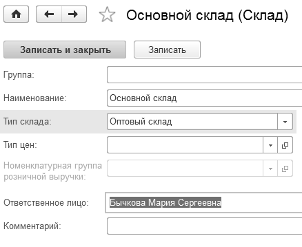 Установите для склада "Магазин" ответственное лицо – Бычкова М.С.