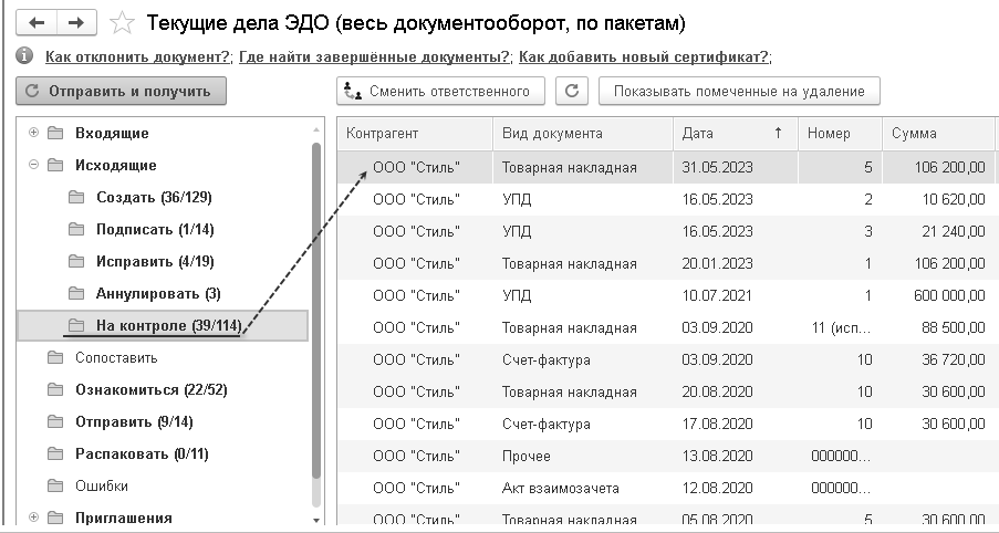 Также действия по созданию и подписанию электронных документов можно выполнять из журнала документов "Счета-фактуры выданные" (рис. 12.9.2). В форме "Текущие дела ЭДО" (для открытия формы выберите одноименную команду в разделе "Продажи" или "Покупки") можно увидеть, документ отправлен, или ожидает подтверждения от покупателя ("На контроле").