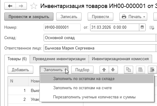 31.03.2026 года создайте документ "Инвентаризация товаров".