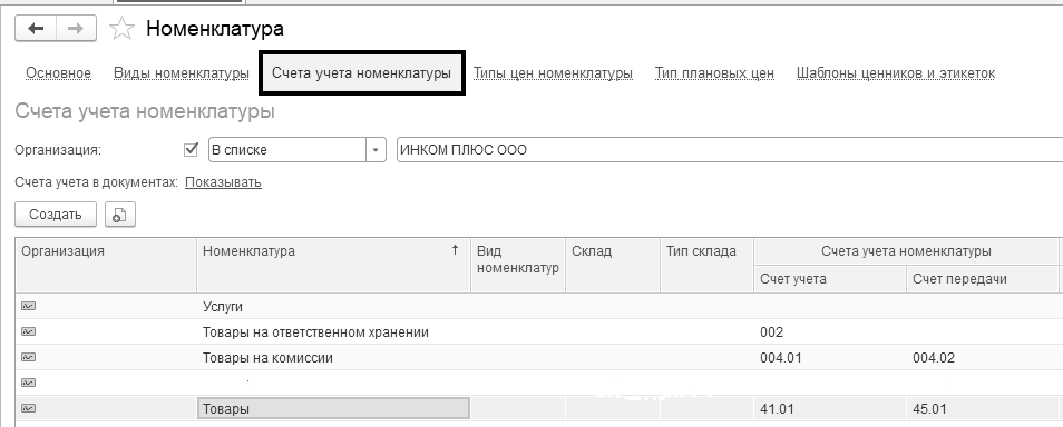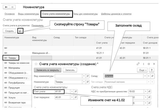 В справочнике "Номенклатура" обратитесь к ссылке "Счета учета номенклатуры", скопируйте строку "Товары", и в шапке формы укажите склад "Магазин", счет учета 41.01 замените на счет учета 41.02 (рис. 12.8.3).