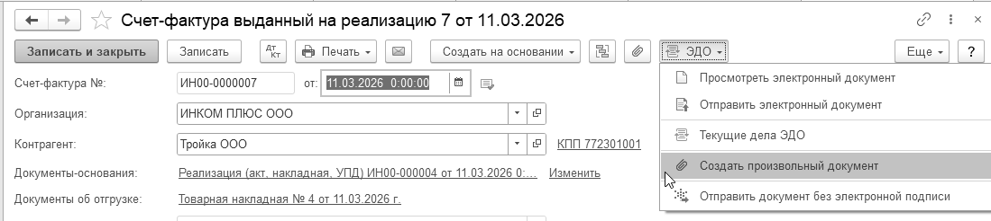 Все начинается с создания электронного документа, для этого необходимо открыть счет-фактуру, и выбрать из списка команд, открываемого по кнопке "ЭДО" команду "Создать произвольный документ" (рис. 12.9.1).