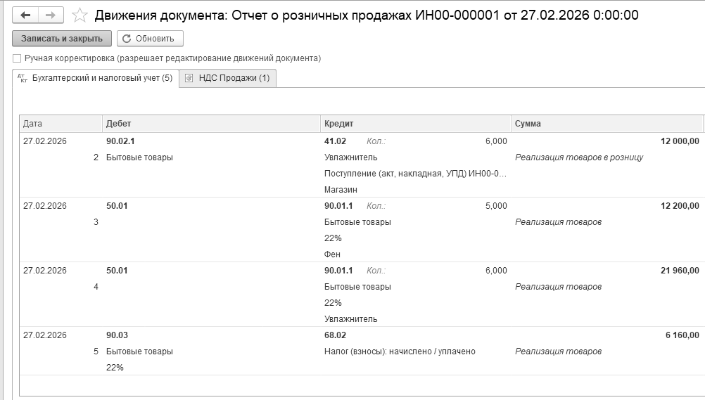Рис. 12.8.6. Движение документа "Отчет о розничных продажах",
