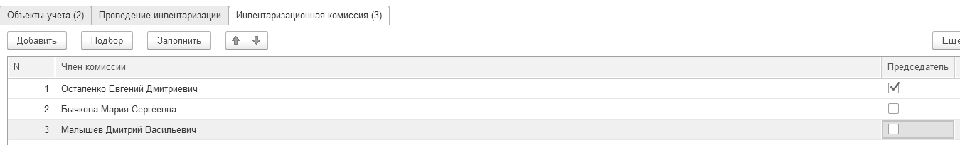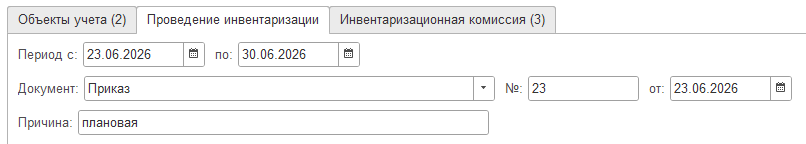 Документ "Инвентаризация товаров" состоит из закладок: "Товары", "Проведение инвентаризации" и "Инвентаризационная комиссия".