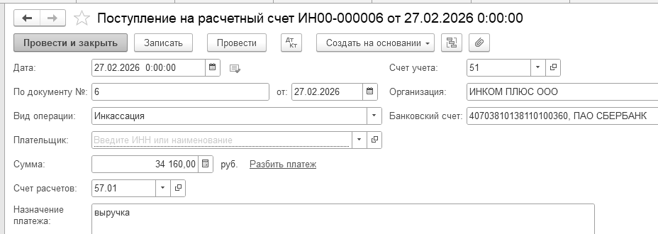 27.02.2026 года создайте документ "Поступление на расчетный счет". Выберите вид операции "Инкассация". Представлен документ № 6 от 27.02.2026 года.