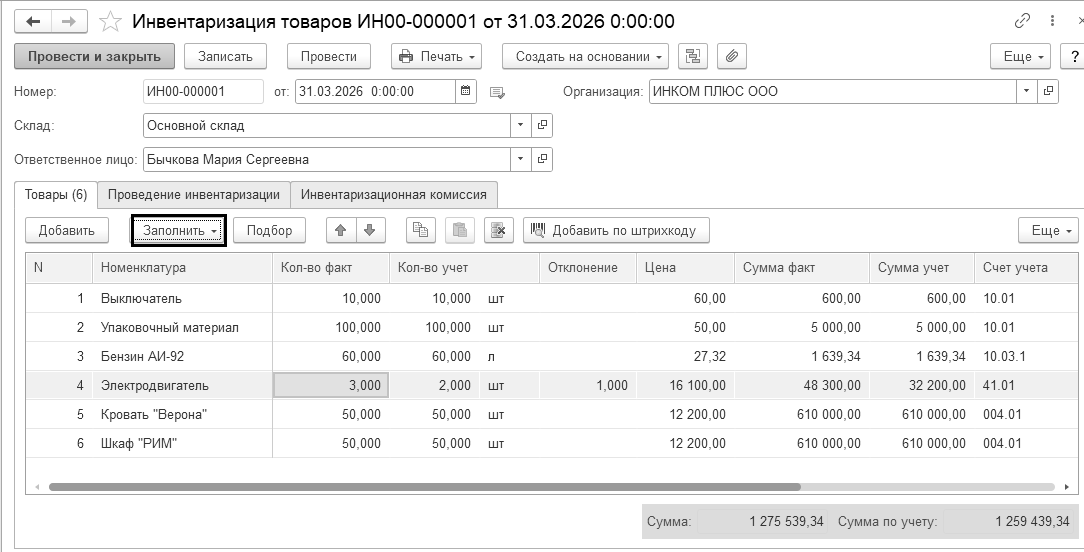 На закладке "Товары" присутствуют графы: "Кол-во факт", "Кол-во учет", "Отклонение", "Цена", "Сумма факт", "Сумма учет" и "Счет учета".