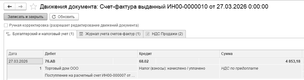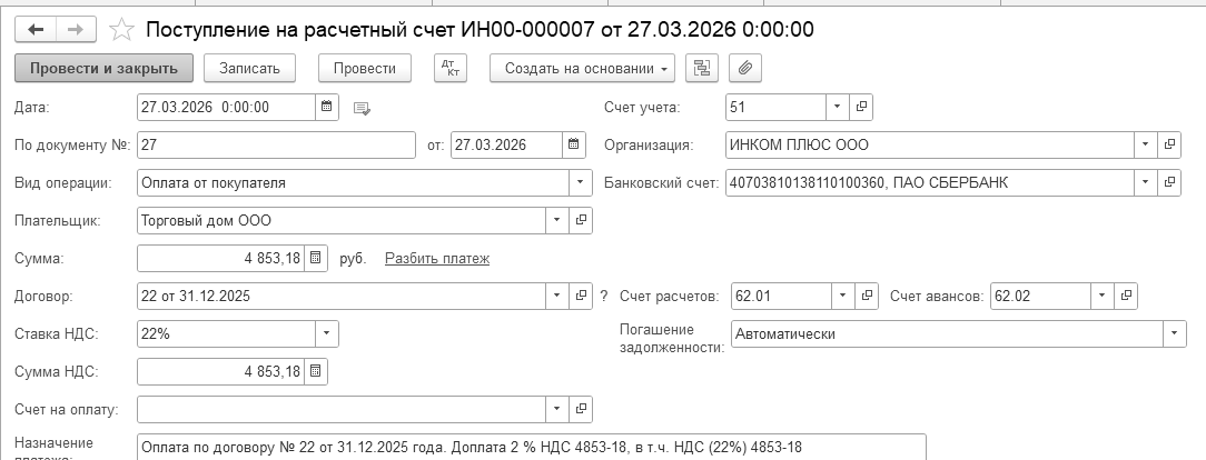 27.03.2026 года получить от покупателя Торговый дом доплату 2% НДС в сумме 4 853 руб., оформить документ "Поступление на расчетный счет". Доплата получена до отгрузки товаров (рис. 13.4).